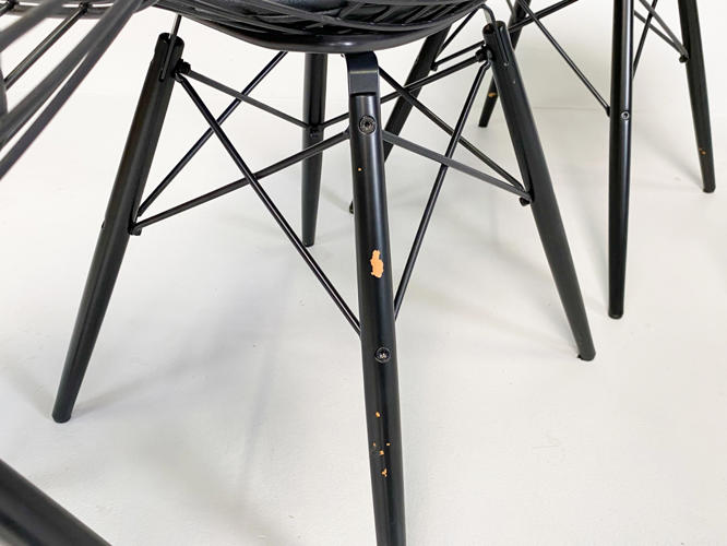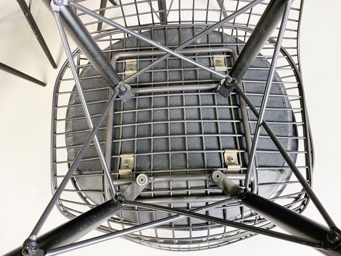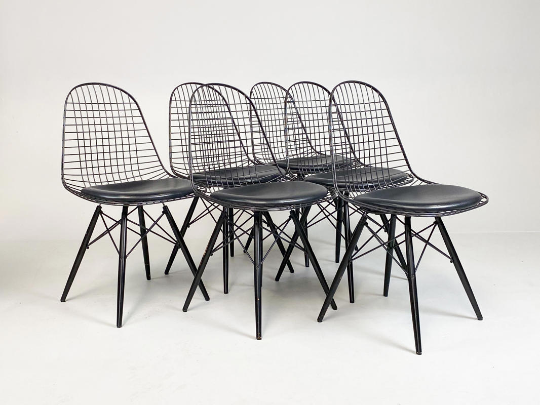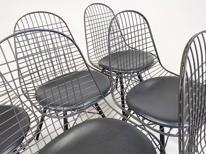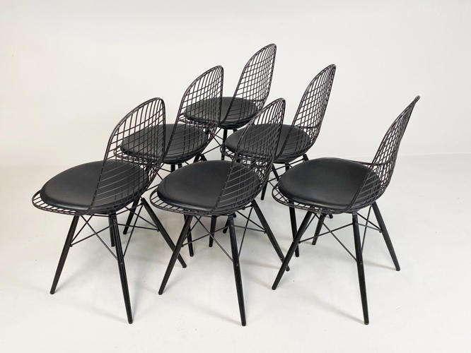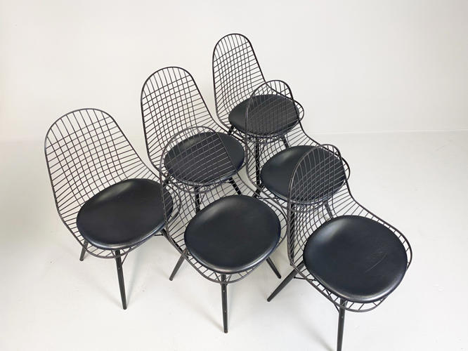 Sæt på 6 "DKR/DKW" Wirestole. Sortlakeret stålnet, opsat på sortlakeret "Eiffel-stel". Sædehynder af sort skind. Fremstår med brugsspor samt enkelte afskalningner på stel. SH. 48 cm.