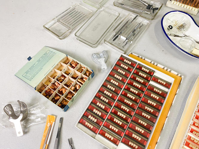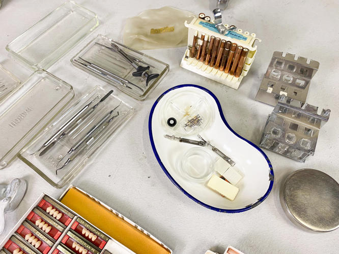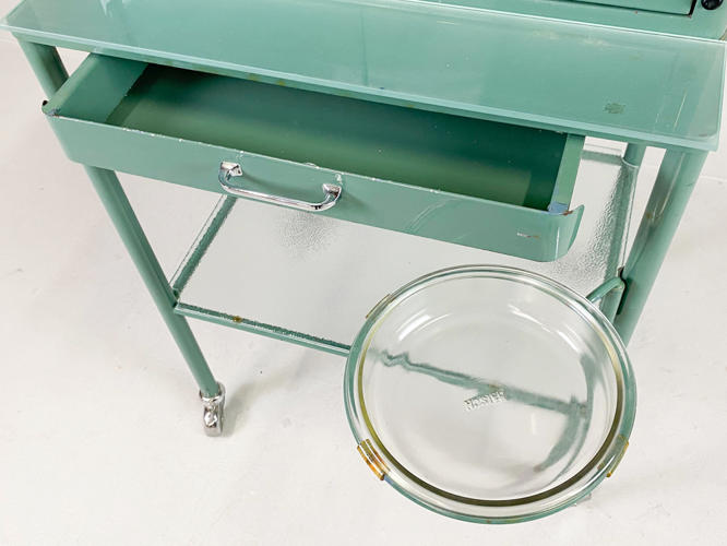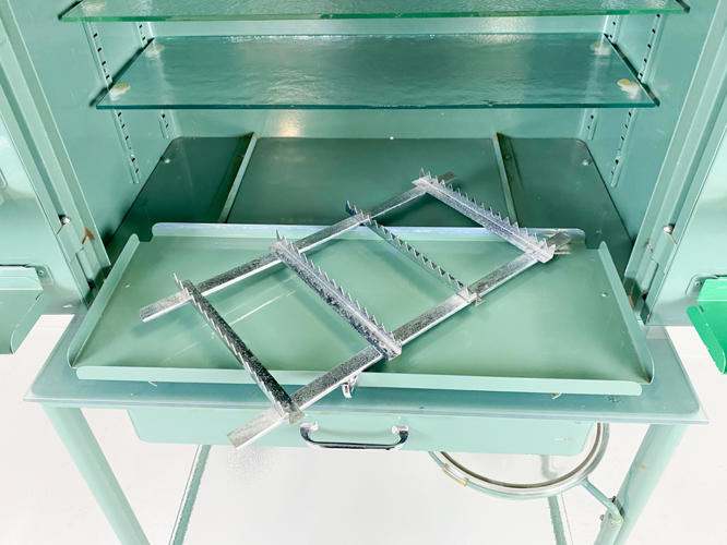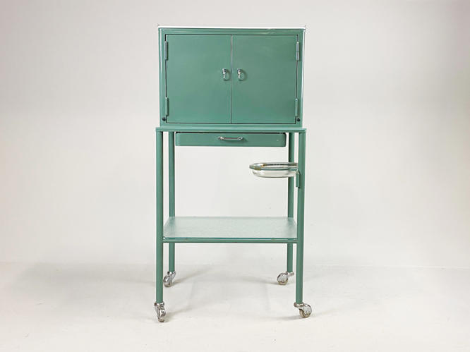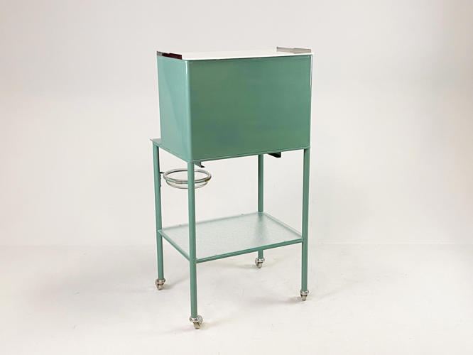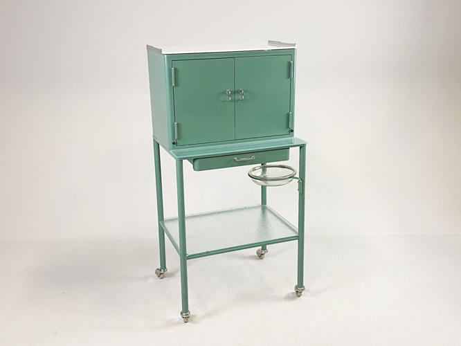 Grønlakeret metal, front med 2 låger samt skuffe, diverse tandlægeinstrumenter medfølger, tidligere givet som gave fra tandlæge til den nyuddannede tandteknikker i 1960'erne, 60 x 47 x 120 cm.