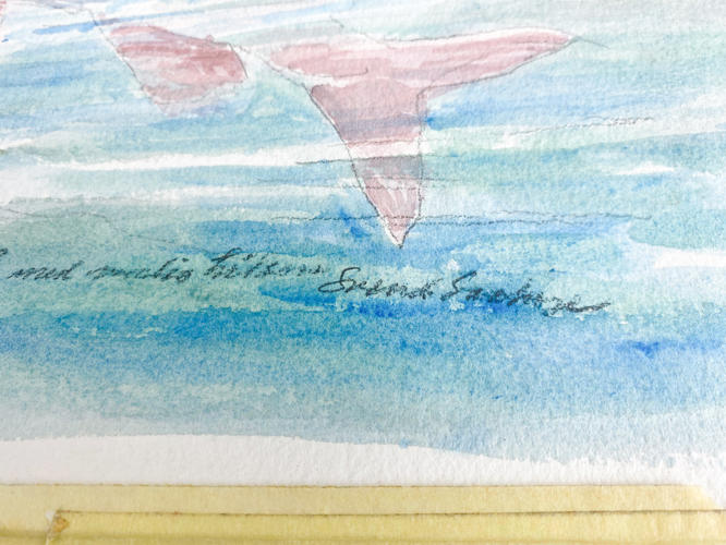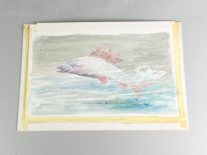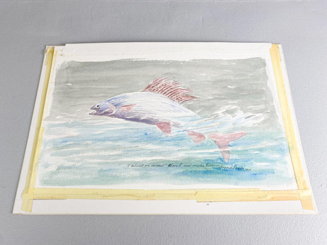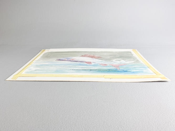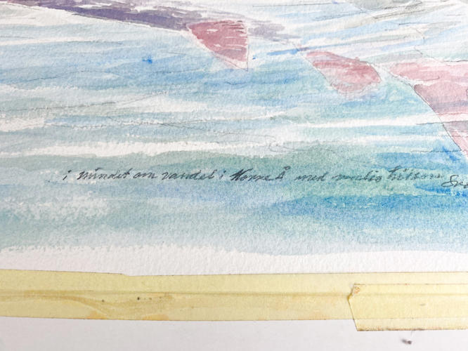Stalling i Nørre å, akvarel uden ramme, signeret Svend Saabye, med dedikation i mindet om vandet ved Nørre Å, 34 x 52, fremstår med tape/klister rester samt let smuds på motiv.