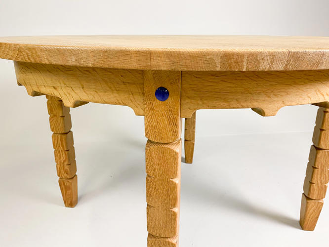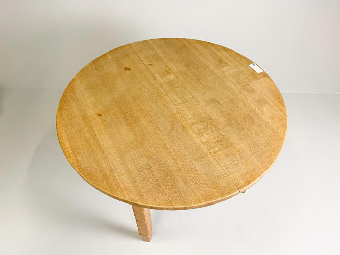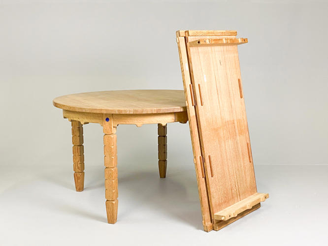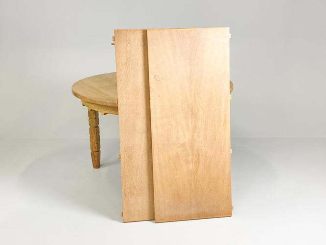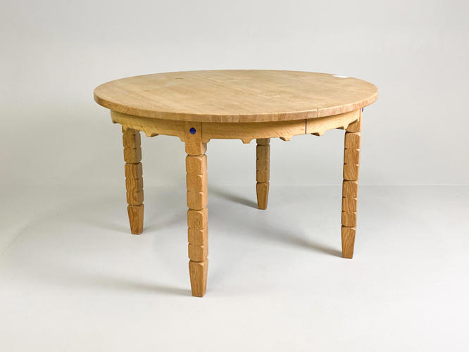 Rundt spisebord af egetræ prydet med stilistiske udskæringer på ben og sarg, medfølgende 2 tillægsplader (50 cm.) heraf 1 med sarg, diam. 120 cm., h. 74 cm., fremstår med enkelte pletter og brugsspor.