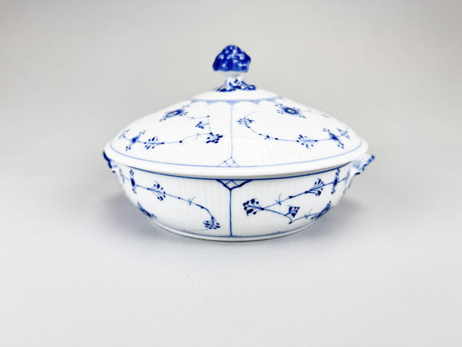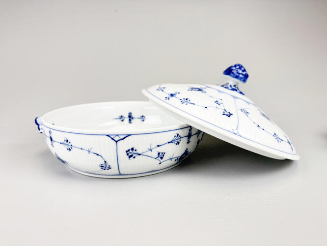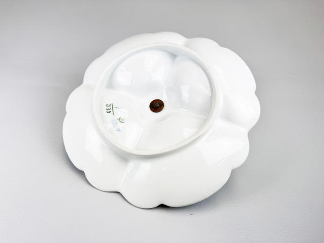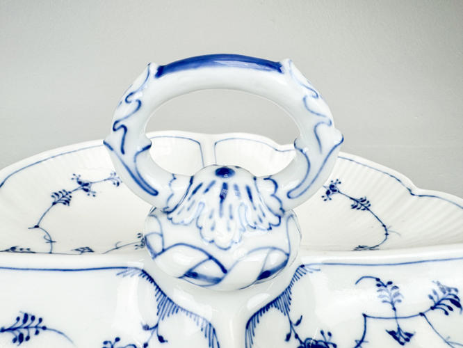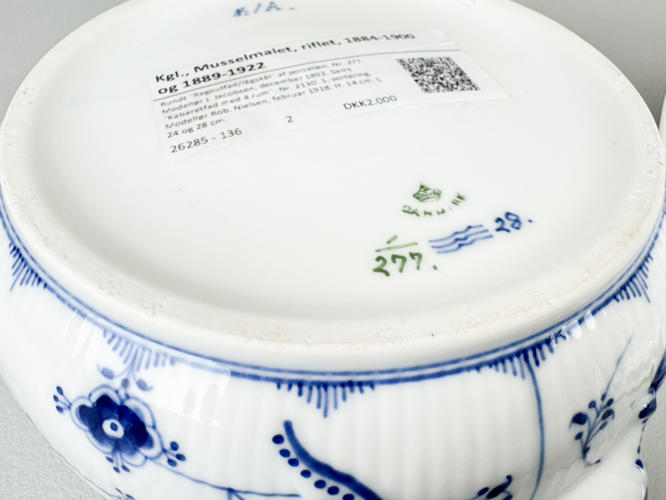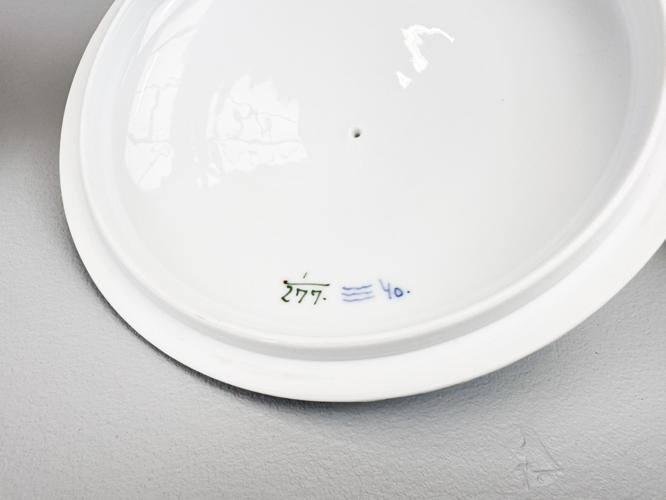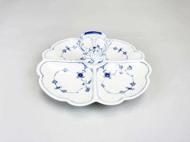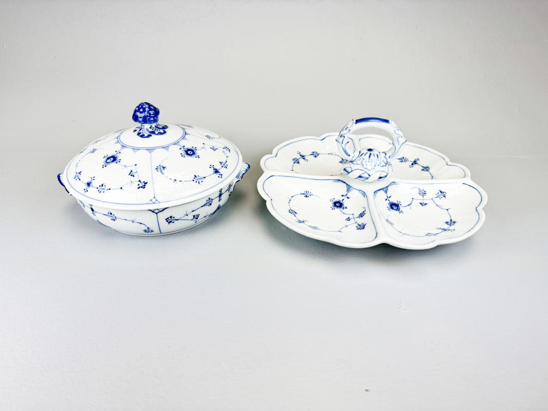 Rundt "Ragoutfad/lågskål" af porcelæn. Nr. 277. Modellør J. Jacobsen, december 1892. Samt "Kabaretfad med 4 rum". Nr. 2130. 1. sortering. Modellør Rob. Nielsen, februar 1918. H. 14 cm. L 24 og 28 cm.