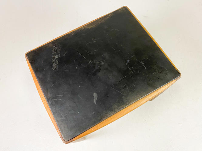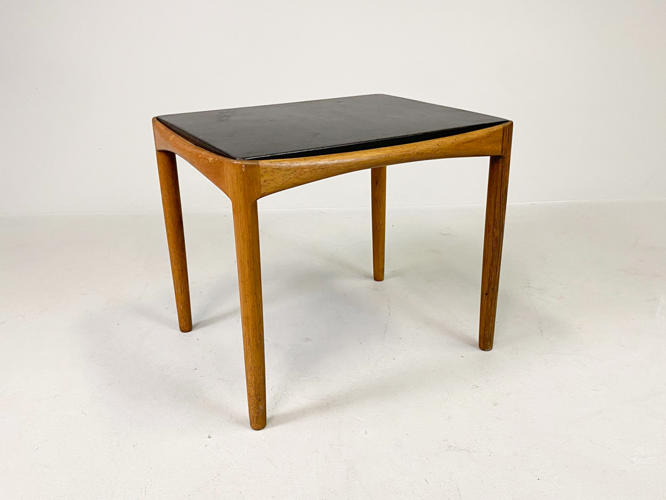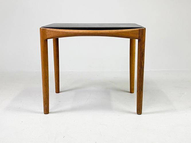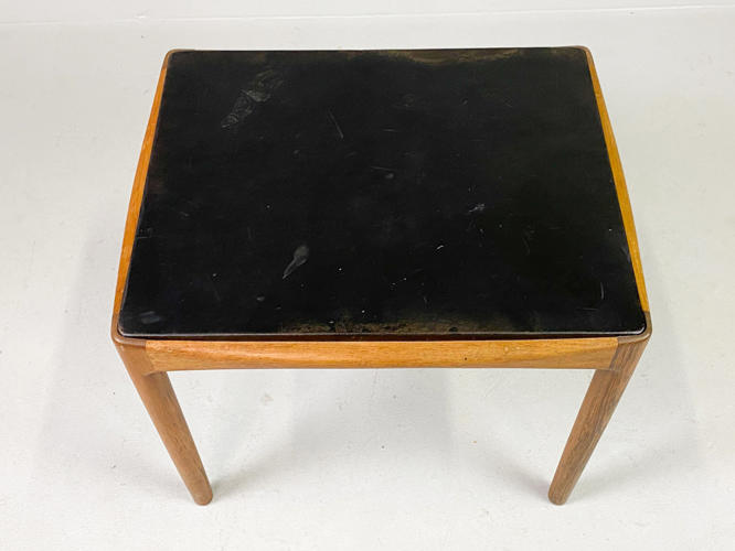 Lille sidebord af palisander, opsat på runde, tilspidsende ben. Top beklædt med patineret originalt sort skind. Udført 1960'erne hos snedkermester Willy Beck, med etiket herfra. H. 40,5. L. 49,5. B. 40,5. Top med brugsspor og mærker.