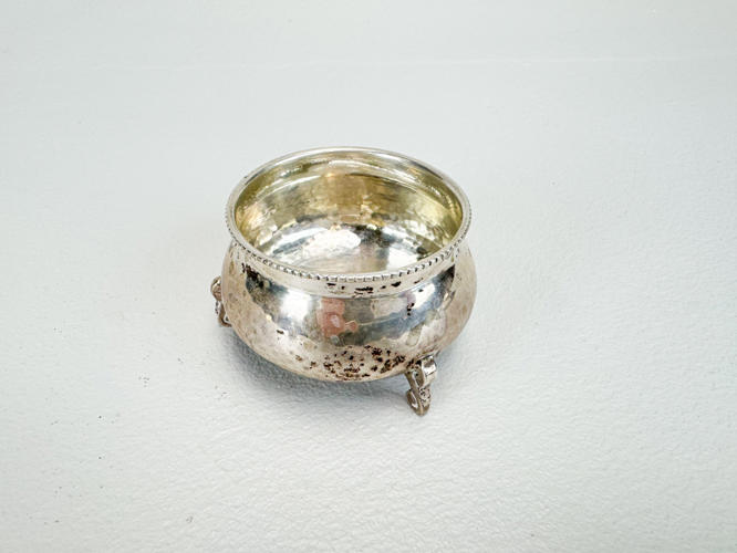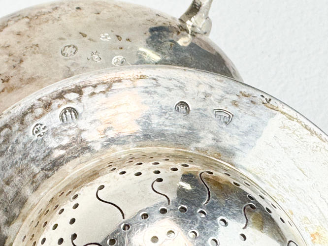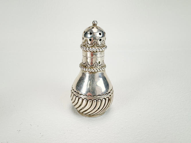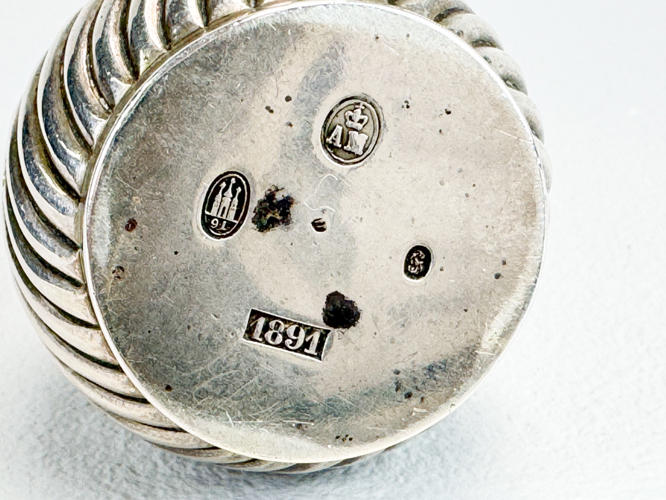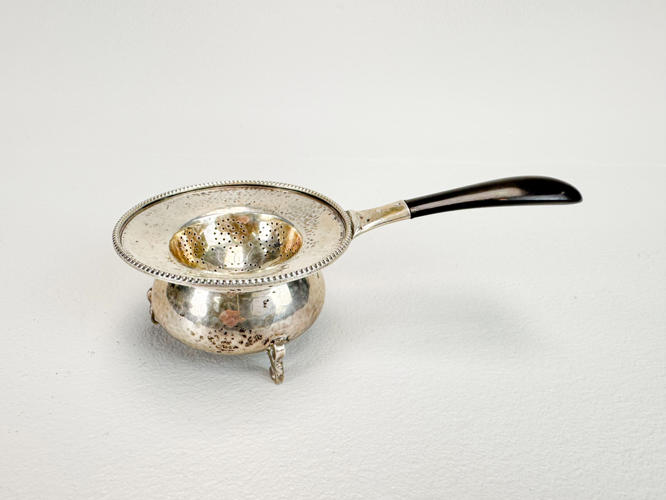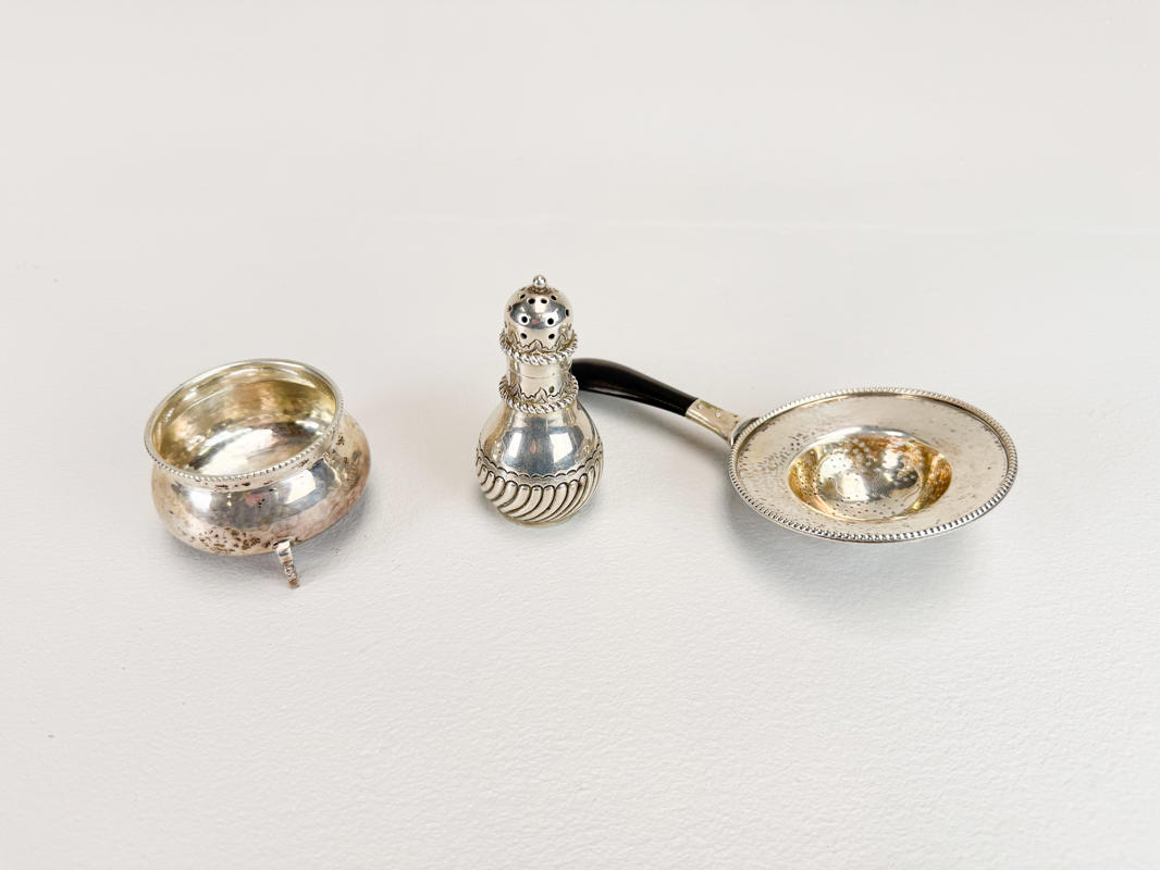 A. Michelsen peberbøsse af sølv, 830. Dateret 1891. A. Dragsted Skønvirke tesi og holder med skæfte af ibenholt. Stemplet AD 1917. H. 8,5 og 4,5 cm. L. 17 cm. Sølv 830. Totalvægt ca. 166,4 g.