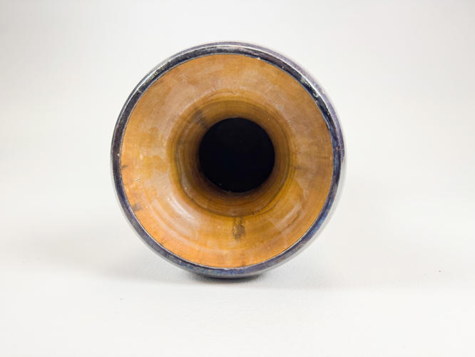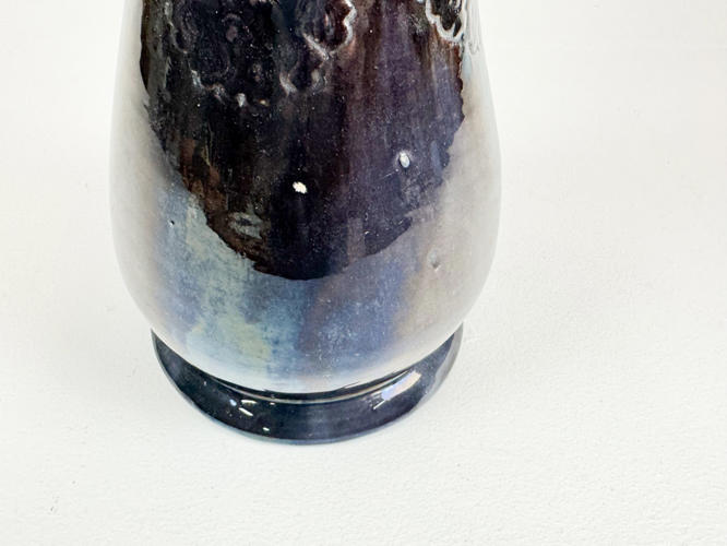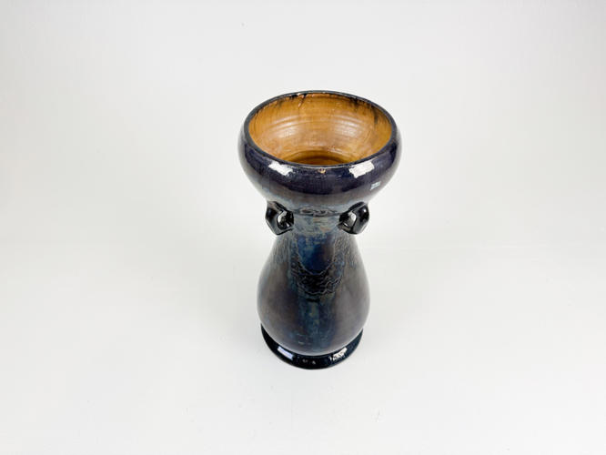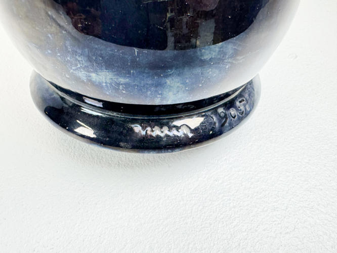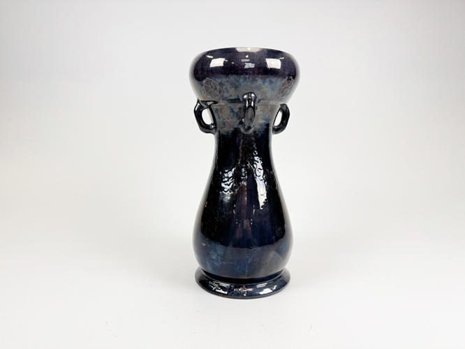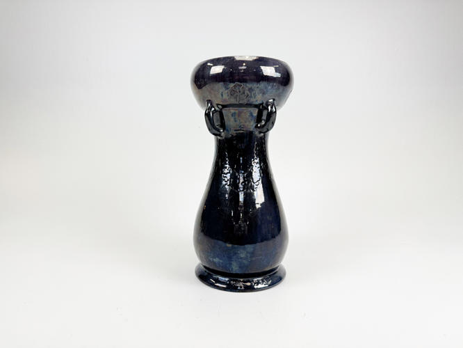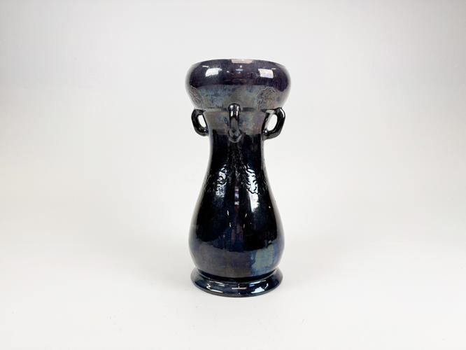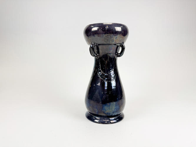 Skønvirke vase af lertøj. Dekoreret med lustreglasur. Dekoreret med 4 hanke samt guirlande i relief. Signeret og dateret 1905 på fod. H. 37 cm. Fremstår med enkelte bobler i glasuren efter brænding.