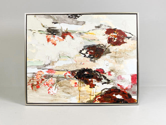 "Et ekko af blomster". Signeret og betitlet på revers. Olie på lærred. 80 x 100 cm.
