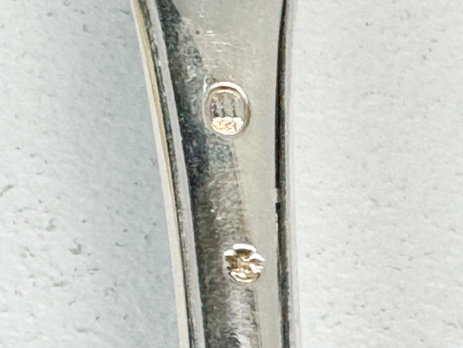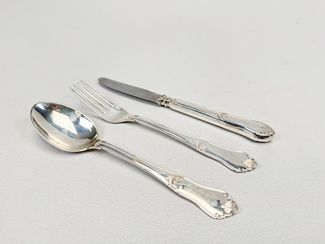 3 dele bestik. Stemplede med tre tårne. Middagsgaffel, kniv og ske. Små brugsspor. Vægt inkl. stål ca. 195 gr.