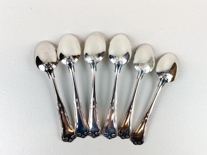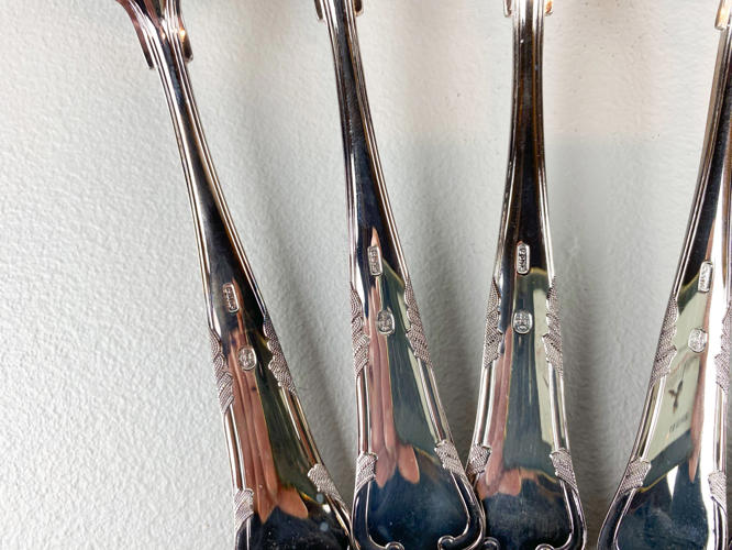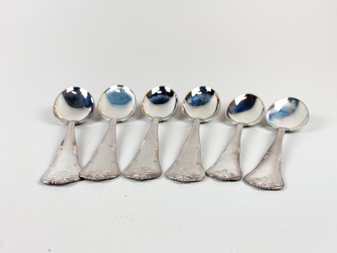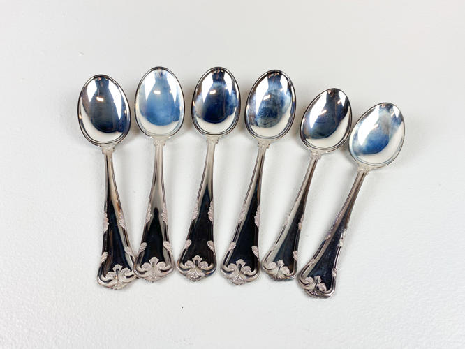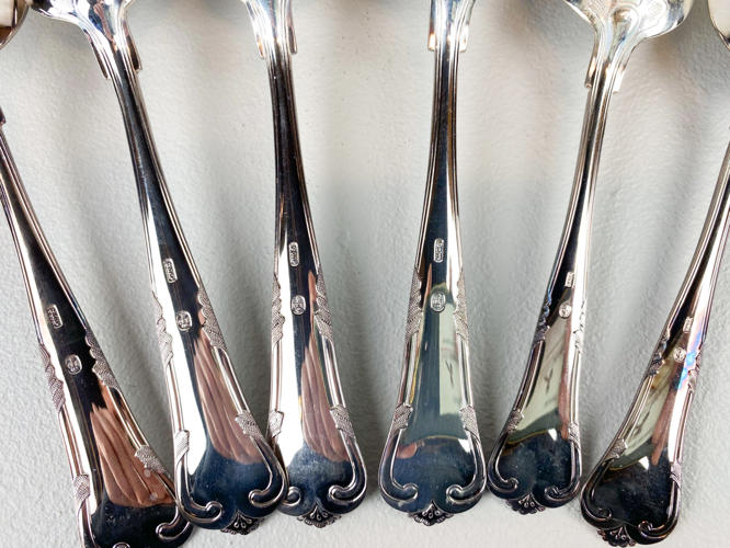 Dele til bestikservice af sølv, stemplet 830, 4 skeer samt 2 dessertskeer, minimal anløben, vægt ca. 302 gr.