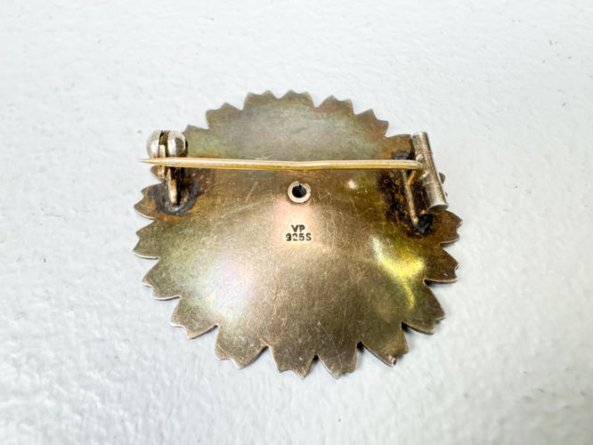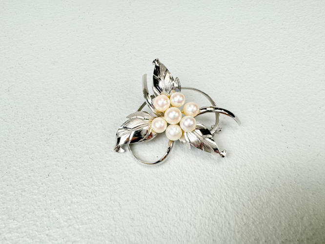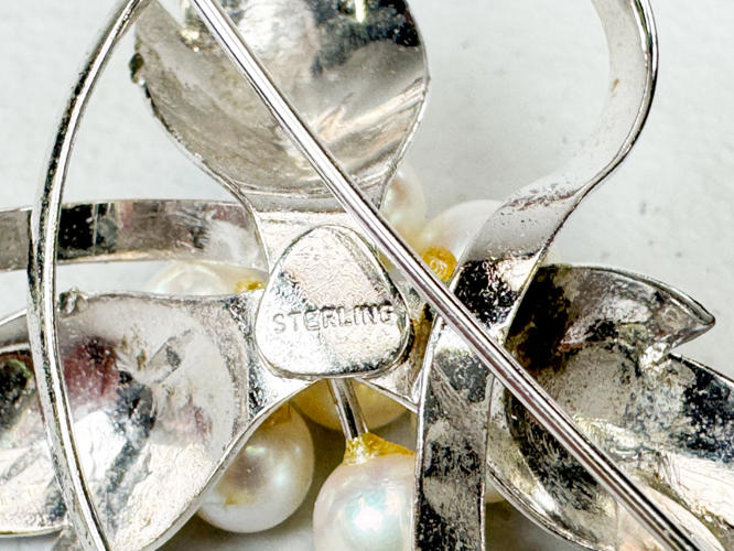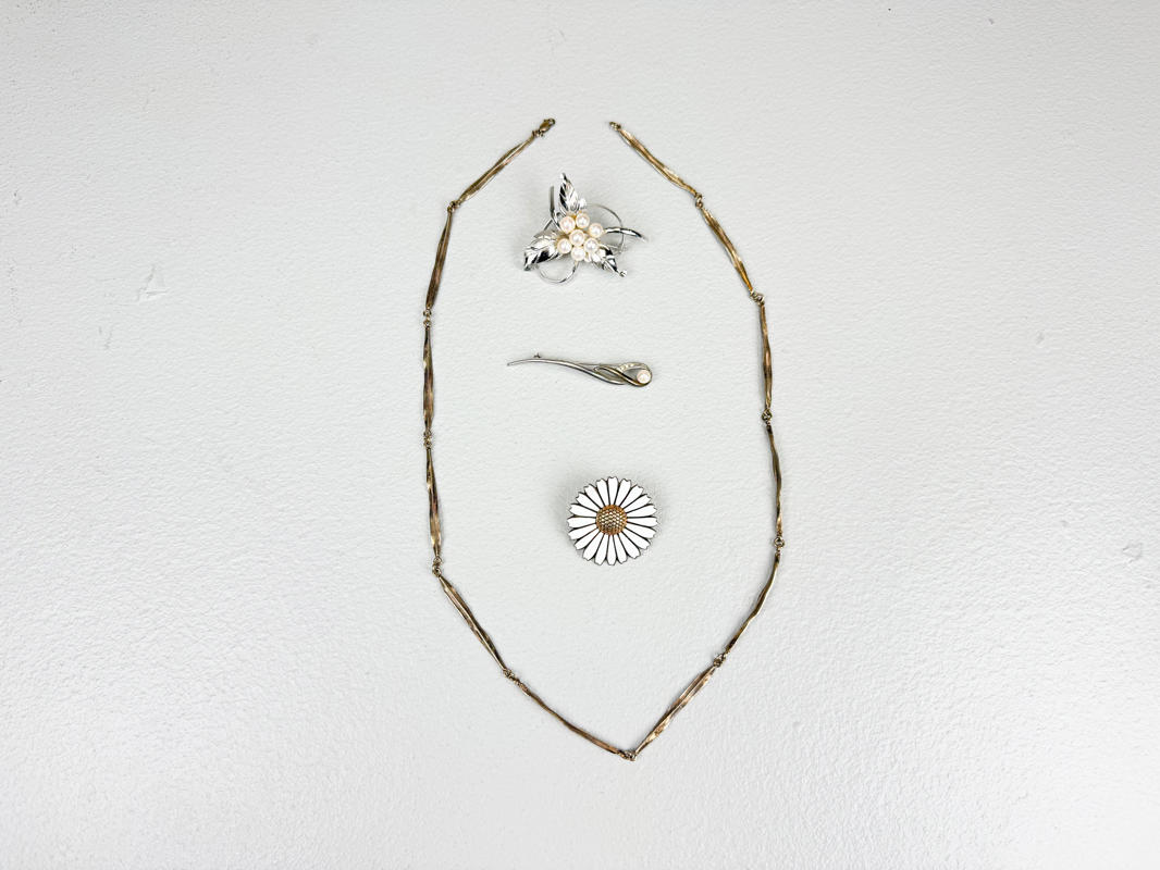 Margueritbroche af sterlingsølv med hvidt emalje. 2 brocher af sterlingsølv prydet med perler samt halskæde af sølv, 830. Totalvægt ca. 50,4 g.
