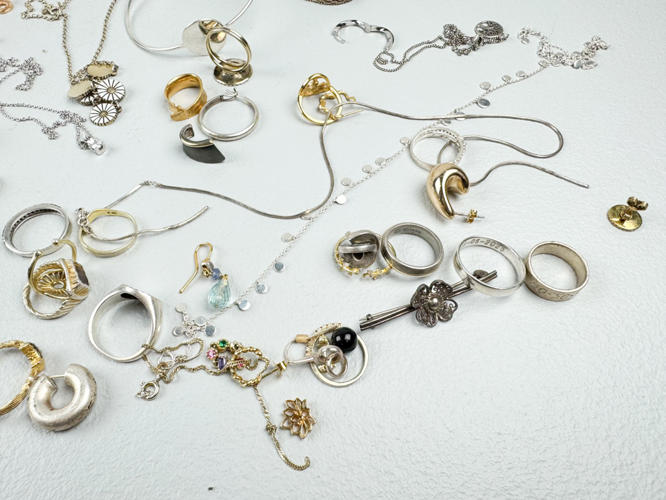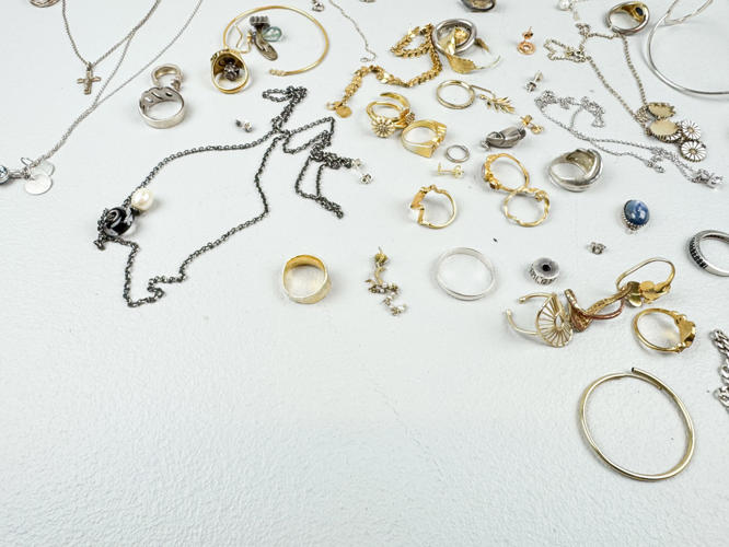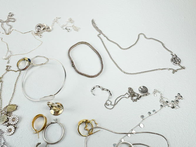 Æske diverse smykker. Hovedsageligt sterlingsølv, 925. Diverse ringe, halskæder, vedhæng m.m. Flere dele prydet med sten, emalje m.m. Totalvægt ca. 298,4 g.