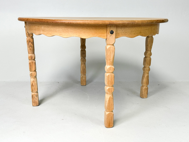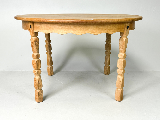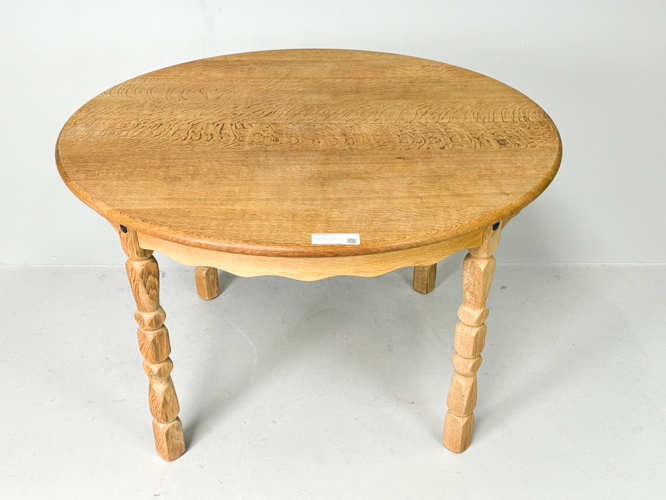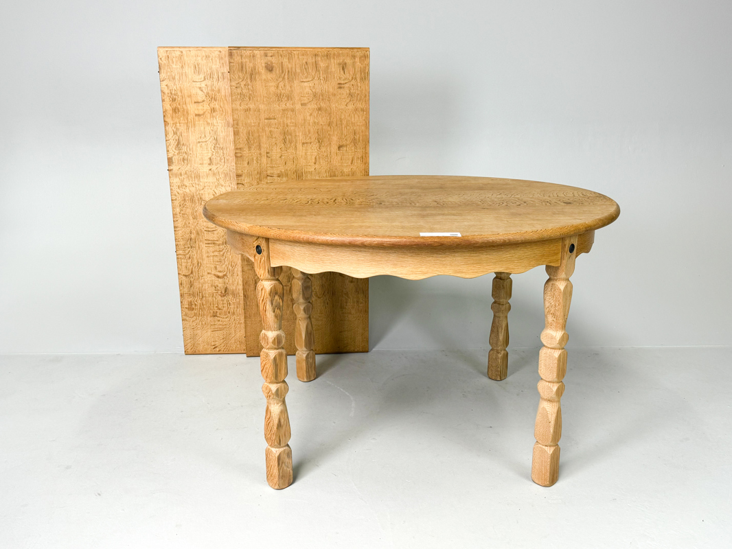 Rundt spisebord af massivt egetræ, ben med udskæringer, medfølgende 2 tillægsplader af 50 cm., dia. 119 cm., h. 74 cm.