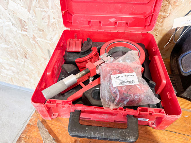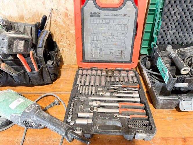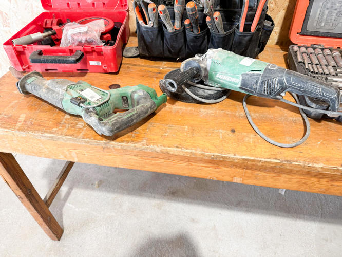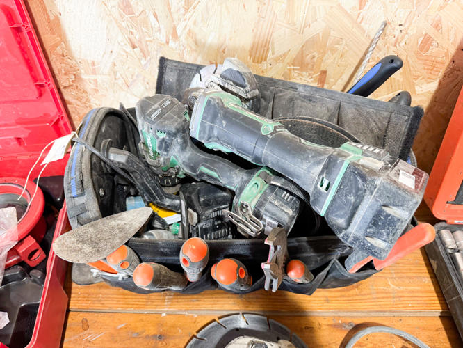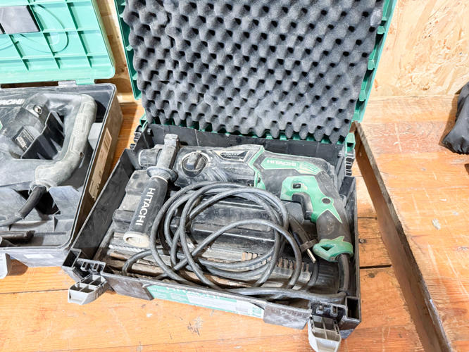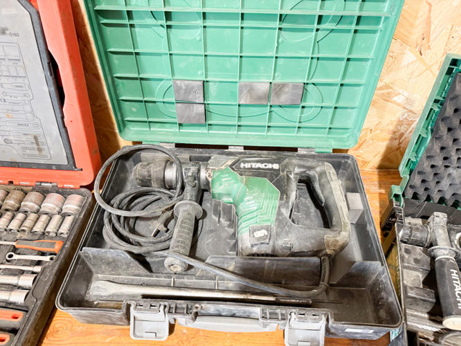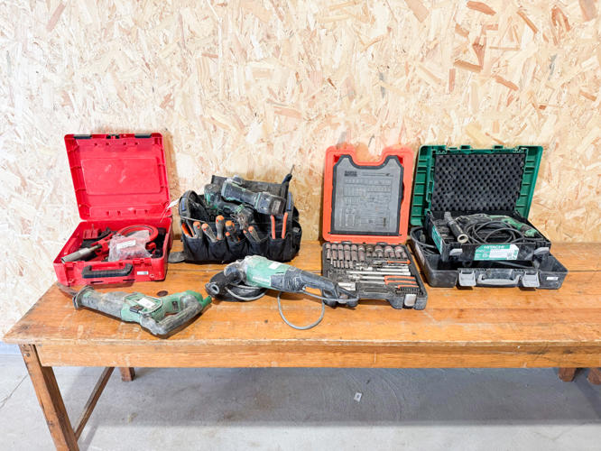 2 stk. Hitachi slagboremaskiner, topnøglesæt, Rothenberg rørskærersæt, 2 stk. Hikoki vinkelslibere, - bajonetsav, skruemaskine samt værktøjskasse med diverse værktøj
