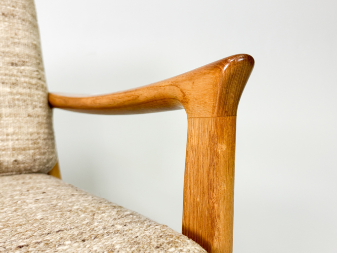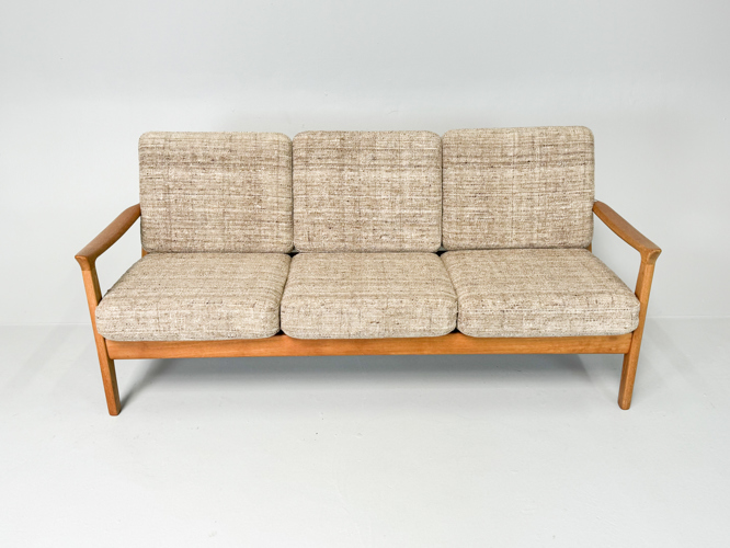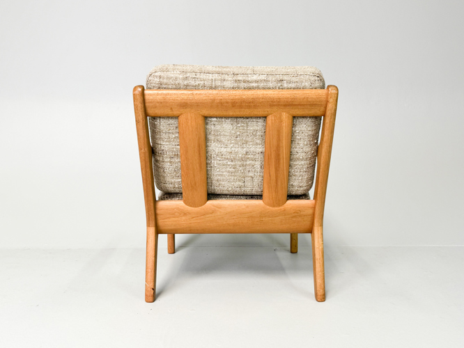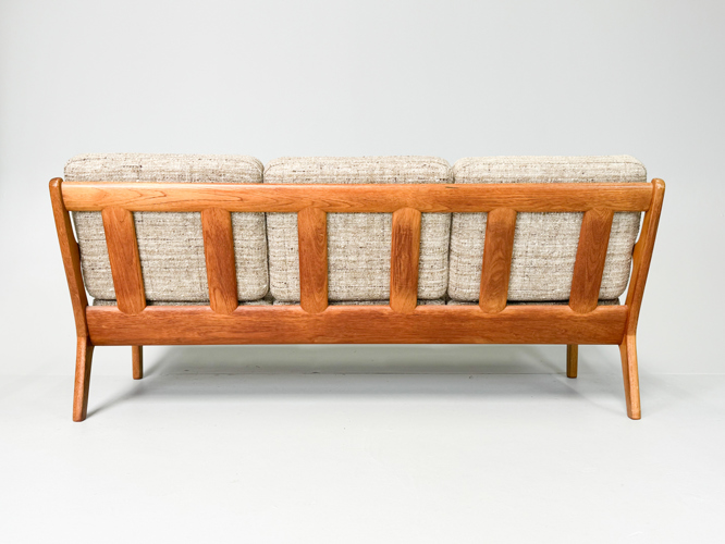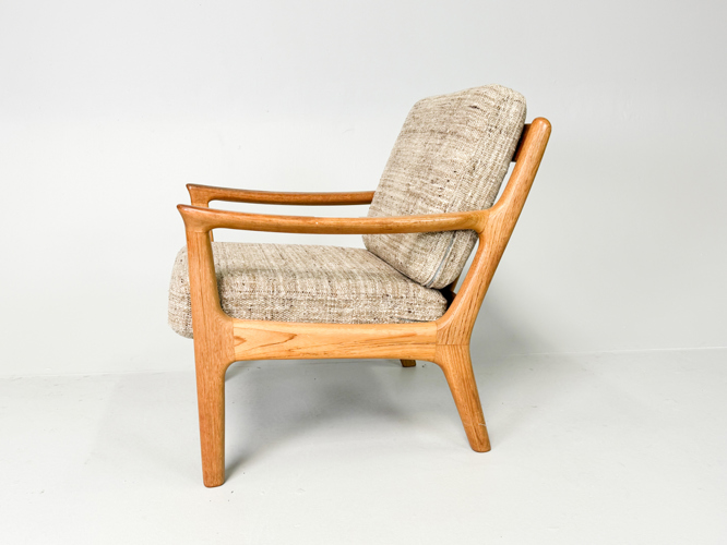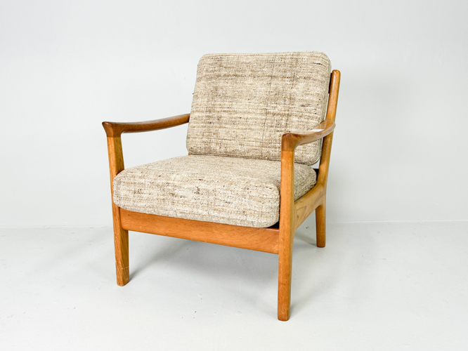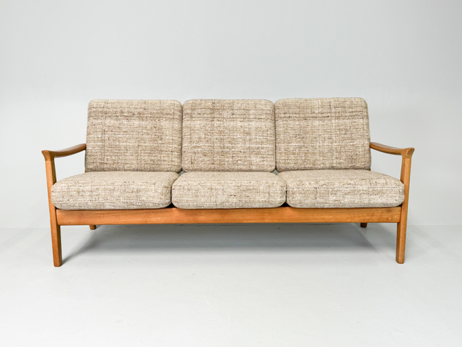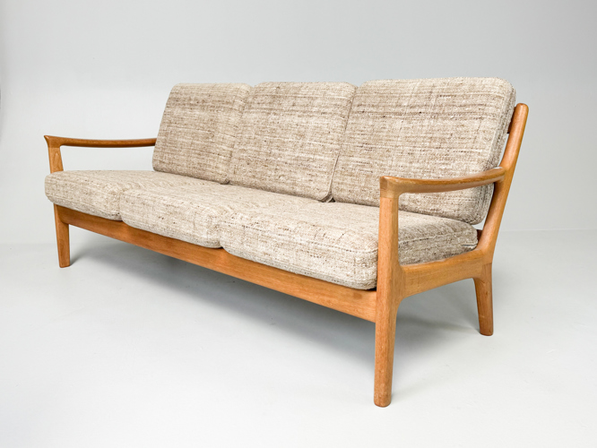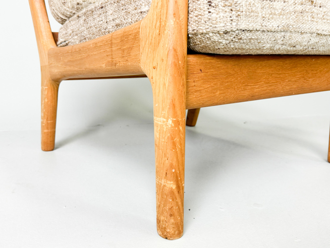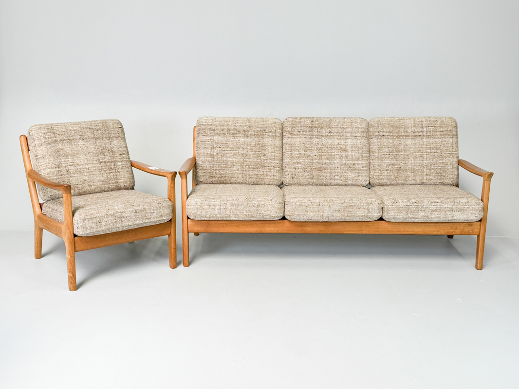 Armchair and 3-seater sofa with solid oak frame, cushions upholstered in light wool, l. 182 cm.