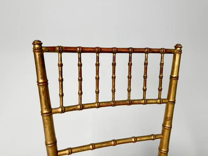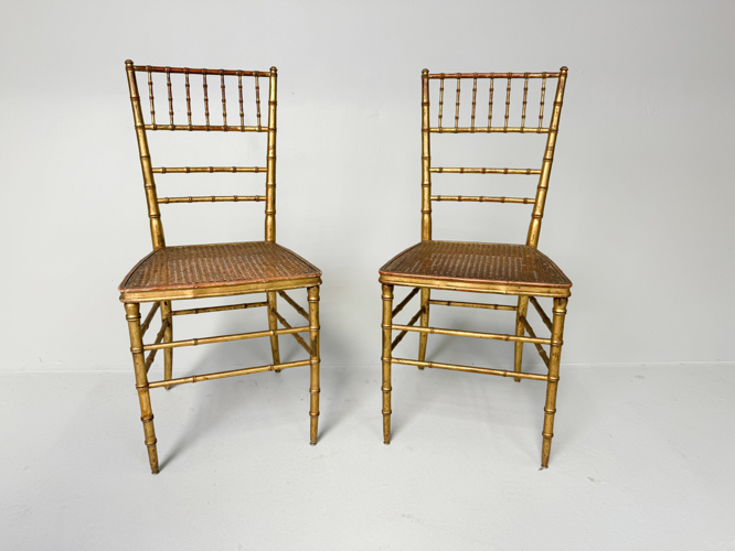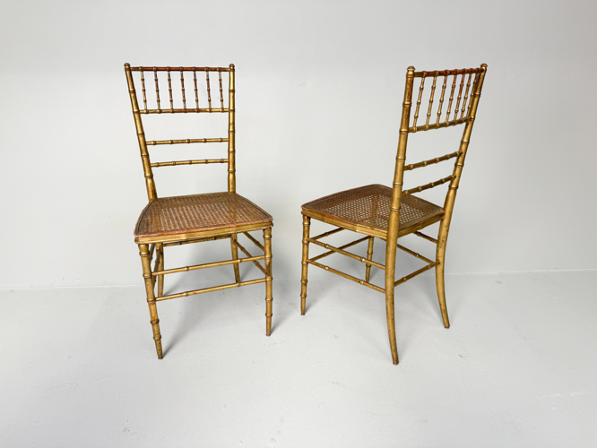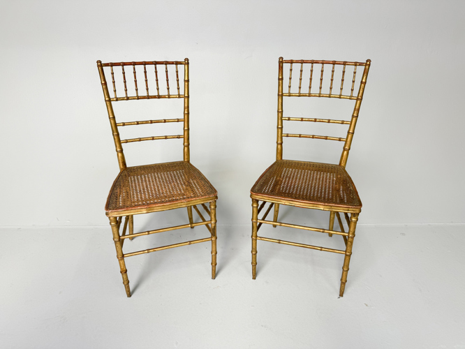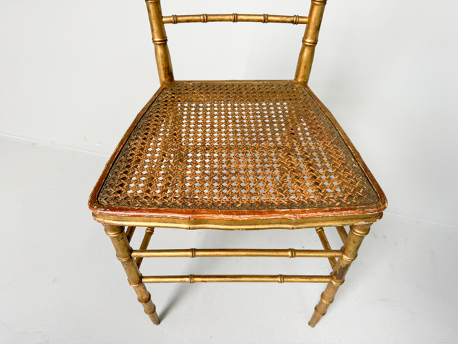 Bamboo-style gilded wood frame, French wicker seats. 39 x 41 x 84 cm.