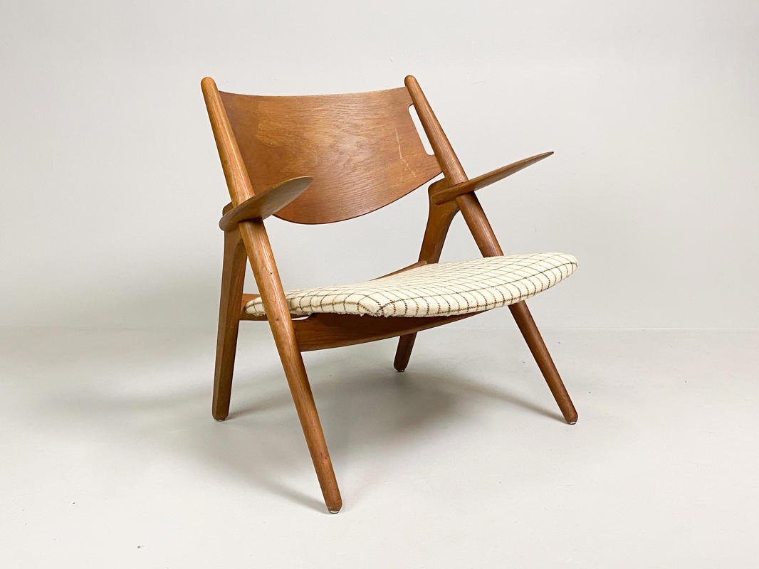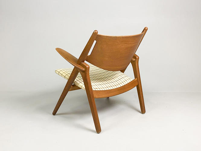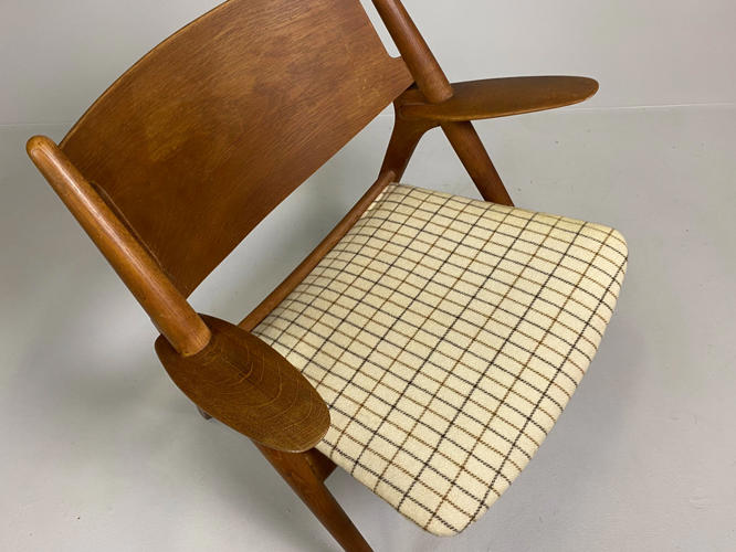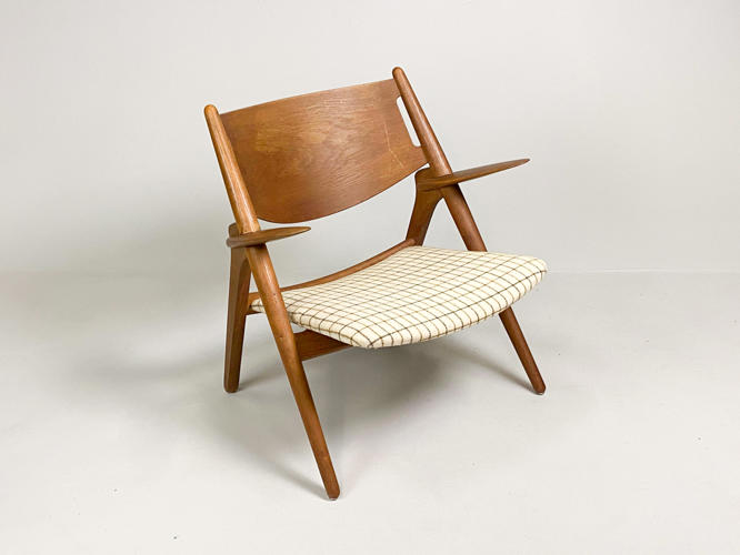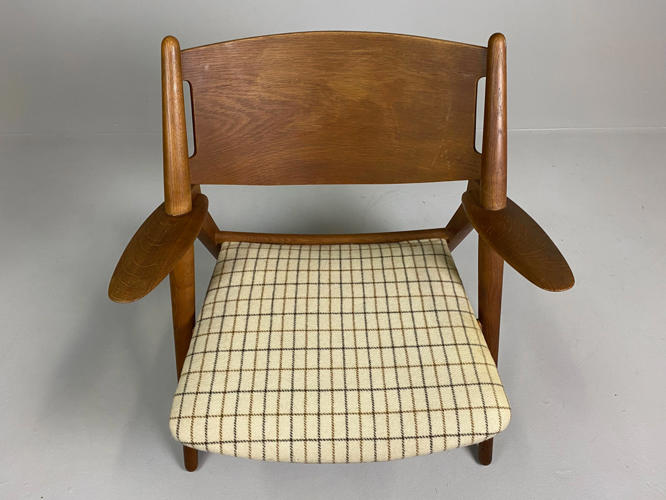Armchair with armrests. Dark patinated oak frame and armrests. Seat upholstered in checked wool. Model CH 28, designed in 1951. Made by Carl Hansen & Son. Not stamped. Armrests appear slightly loose.
