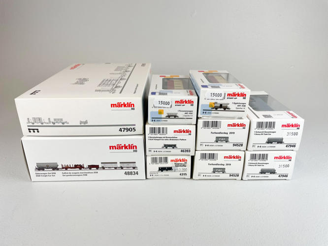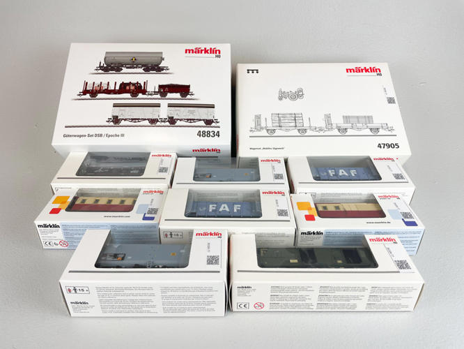 Two car sets, no. 47905 and 48834 and eight cars, no. 4107, 4108, 4315, 46393, 47946 and 94528, etc. appear unused in original packaging, some light pressure marks.