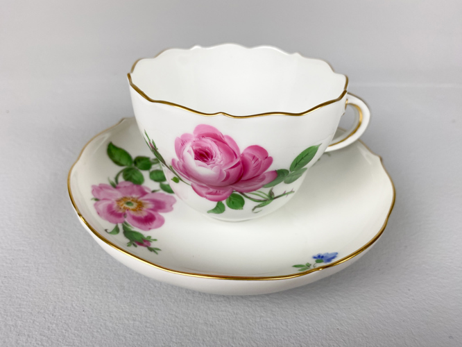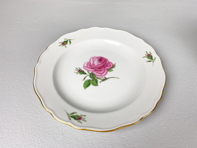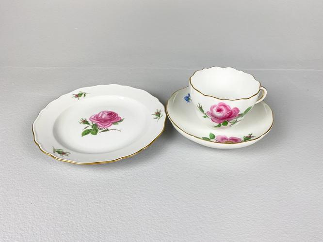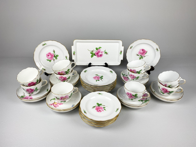 Dele til kaffestel, dekoreret med lyserøde roser, bestående af par 10 kaffekopper, 5 sidetallerkener, 8 kagetallerkener, sættebakke. Hovedsageligt 2. og 3. sortering.